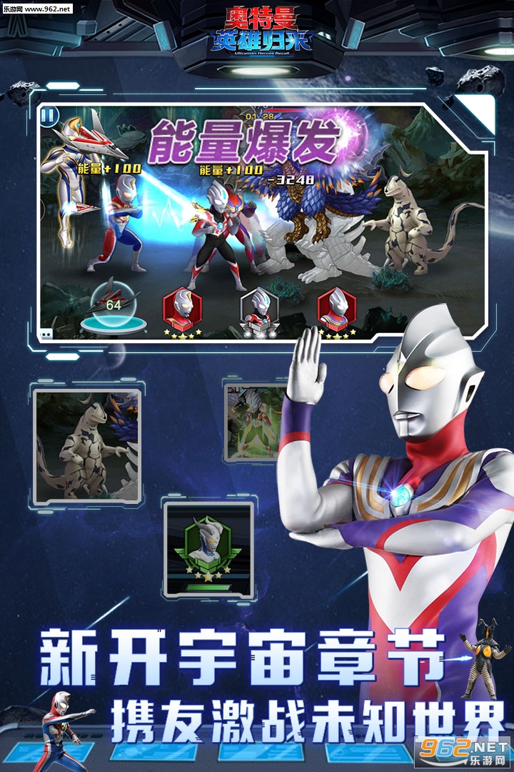 在高度还原特摄剧形象的同时,游戏更是创新打造各奥特曼的技能差异性,引入前排、中排、后排概念,技能上有前排攻击、后排攻击、治疗回复、AOE伤害、控制等技能差异化设定,实现技能丰富搭配,让游戏趣味性与策略性大大提高。