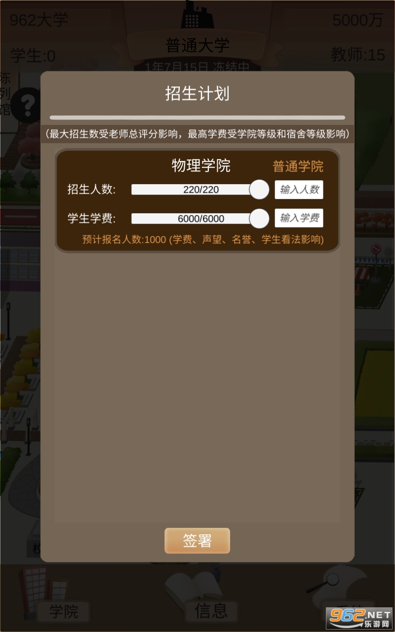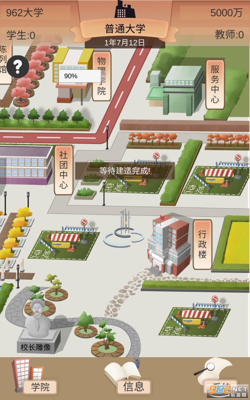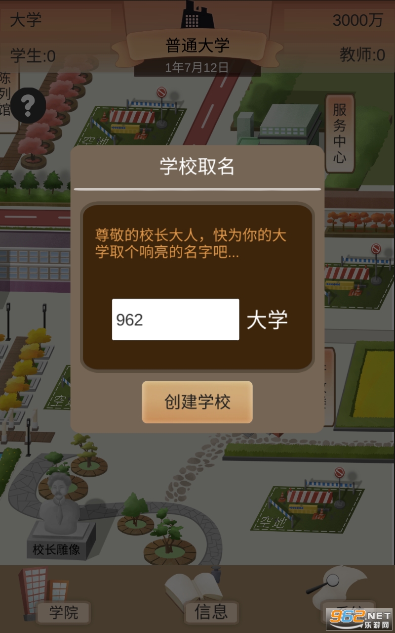 你建立了你的大学校园,然而没有学生,没有名气,也没多少钱。你可以处处为学生老师着想,成为亲国亲民的好校长,也可以当一个只看钱的黑心校长。你的目标就是一步步把你的大学建设成你想要的样子,走上世界巅峰。