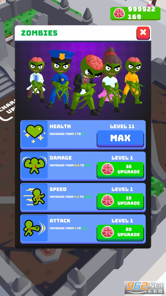 通过选择要升级的特征来定制您的游戏策略,包括最大友军僵尸、生命值、伤害、攻击速度和移动速度。