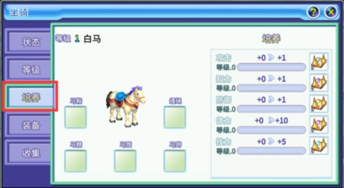 坐骑可通过专属道具培养攻击、知力、防御、体力、技力五大属性。每次培养消耗对应材料,存在暴击机制可额外获得经验值,培养等级上限受坐骑当前等级限制。
