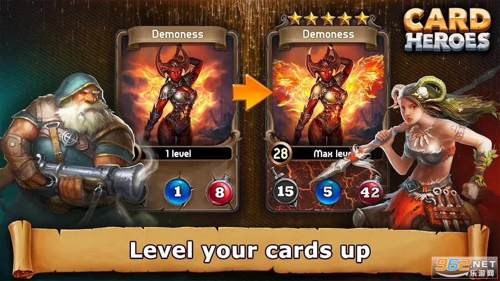 独特的英雄。在 PVP 竞技场中战斗,补充你的套牌英雄收藏。他们可能是法师、术士和其他拥有毁灭性法术力量的强大英雄,也可能是拥有强大钢剑的圣骑士,也可能是身披利刃的狡猾刺客。收集每日奖励来增加你的卡牌收藏并打造一副强大的卡牌。