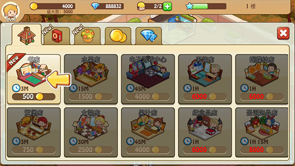 1、进到游戏后,首先,让我们建设一个供顾客购物的『书店』,点击商店——选择书店即可。