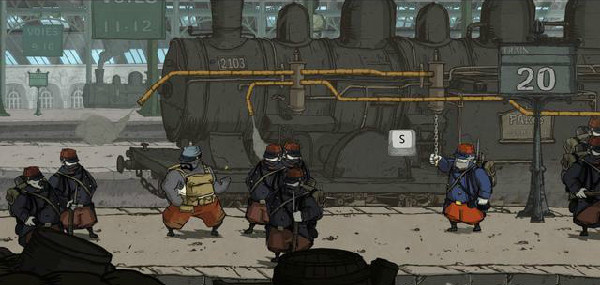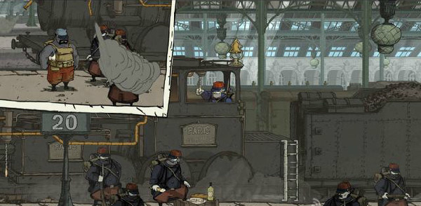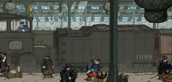 4、下一个场景我们的目标是要登上列车之上,但是梯子有士兵阻挡,在这名士兵旁边有一个军乐队,按照2-4-3-1”的顺序与乐手对话,士兵就会自行离开【收集品5】,最后在车顶之上往左走,拉动另外一个链条机关赶走另外两名士兵即可。