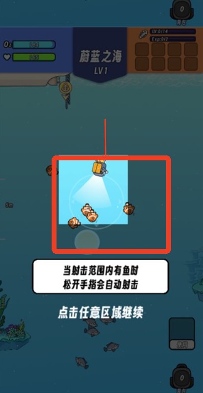 3、在移动的时候可以瞄准范围,当鱼进入之后潜水员会自动射击捕获猎物。