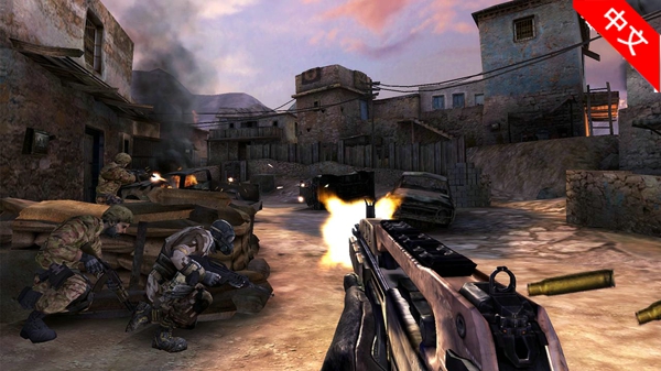经过大门会触发剧情,这时候玩家将控制一台重机枪扫射出现的敌人。用屏幕左右侧的按钮锁定敌人的方位然后射击就可以杀敌。注意重机枪有热度提示,过热将无法使用。