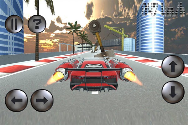 关卡设计以空中跳跃为核心玩法,驾驶飞车从一栋大楼斜坡腾空而起,精准降落在另一栋建筑屋顶,途中拾取散落的燃油桶为引擎充能,进一步提升冲刺速度,极具爽感。