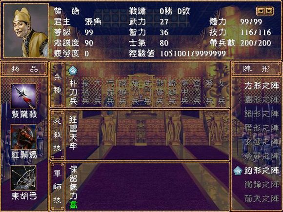 通过搜索”指令可以找到武将,更多的是找到诸如武器、马匹、兵符和特殊物品。搜索到的物品和战斗时缴获的战利品可以通过使用物品”分配给所需武将,用于提高武将的能力或忠诚度。也有一些物品需要武将的等级或是能力达到一定的要求才能使用。