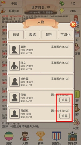 4、点击【人物】可以对球员进行培养,球员属性分为六边形,培养一次随机提升一点。