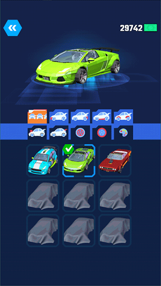 4、另外我们还可以自由选择已解锁的车辆,还能更换各个汽车配件,如轮胎、尾翼、车漆等等。