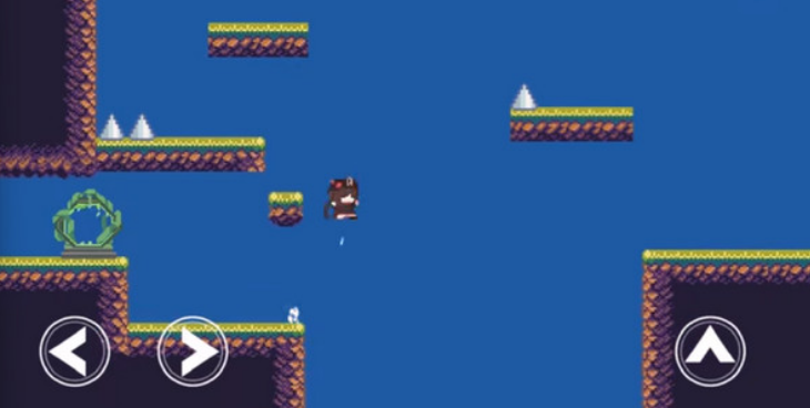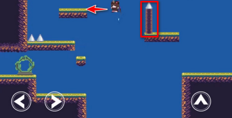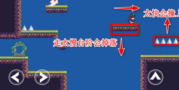 2.注意,第一个陷阱要出现了,我们快速跳上去触发陷阱,然后立马回到安全的小台阶上。