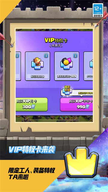 使用全新兵种进行对战,包括狂暴野蛮人、隐秘弓箭手、巨人拳击手、加农炮战车以及新英雄——战争机器。
