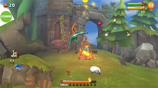 ●游戏中的生物有:人(农民骑士等)、地精、人畜无害的鸟类、各类猛禽、猪牛羊、蜘蛛、各种飞龙等,不同尺寸的飞龙所能捕食的动物都不同,玩家可以通过金币解锁、培养、装扮自己的飞龙。