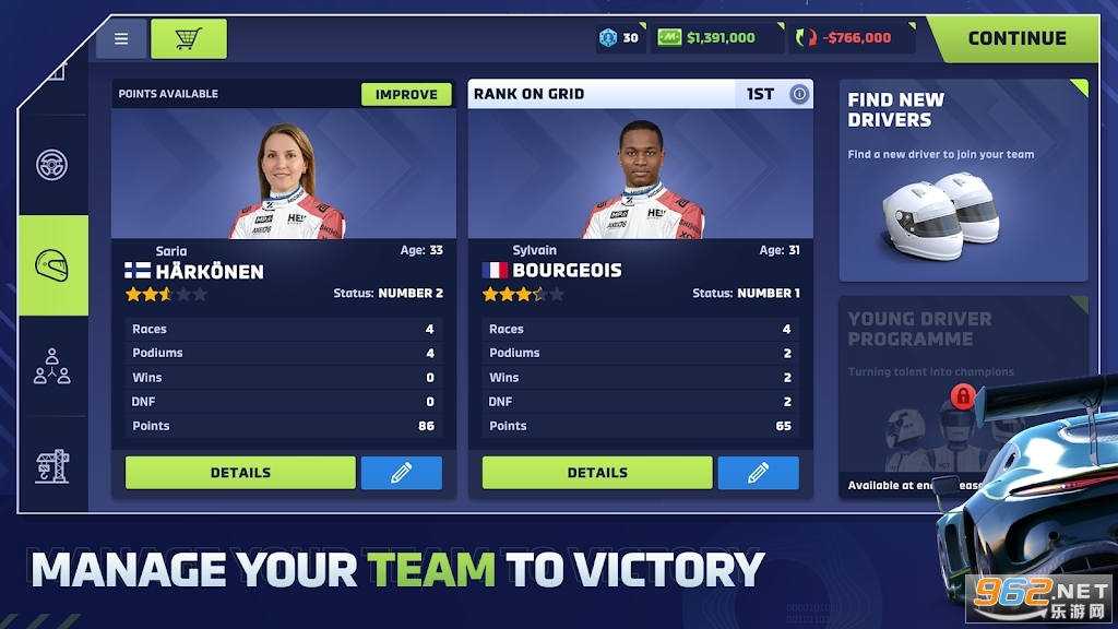 精心挑选杰出的车手并打造世界级的赛车强队。与车手密切合作,确保杆位并制定进站策略,从而统治比赛。