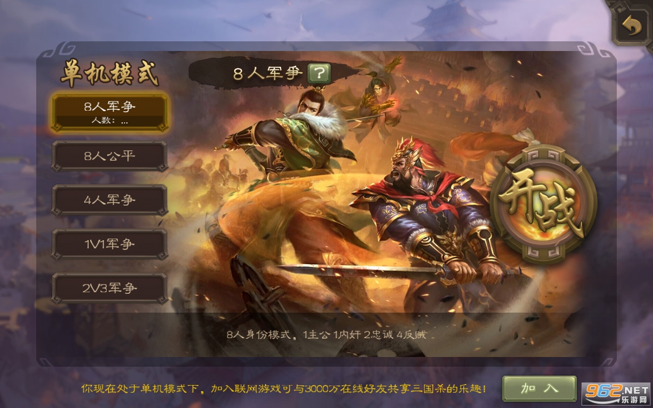 与其他玩家进行正面交锋,当所有玩家都被淘汰后,剩下的玩家将会获胜胜利,带领自己阵营的角色走得更远。您可以单独选择武将角色,挑选阵营,升级并改变武将的性格技能,以发展你的个人特质和策略。