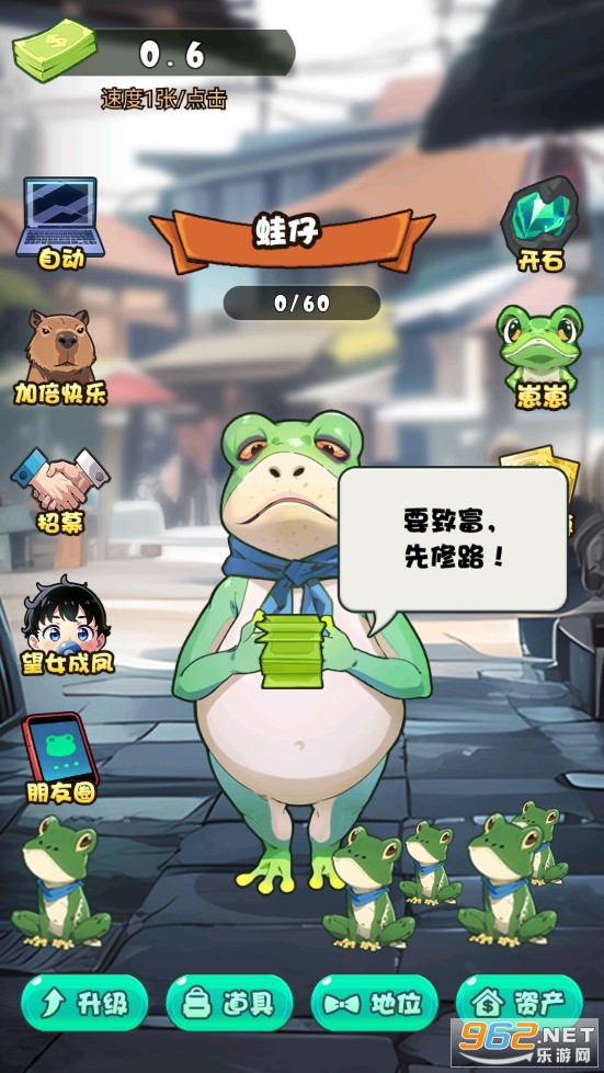 《蛙儿子逆袭记游戏》是一款画面清新的以青蛙为题材的放置点击类休闲手游,游戏中玩家的任务就是帮助一只青蛙赚钱然后娶老婆,可以通过点击的方式来赚钱,可以解锁各种道具等来提高收益,可以手动点击,也可以自动点击放置挂机,轻松体验游戏。