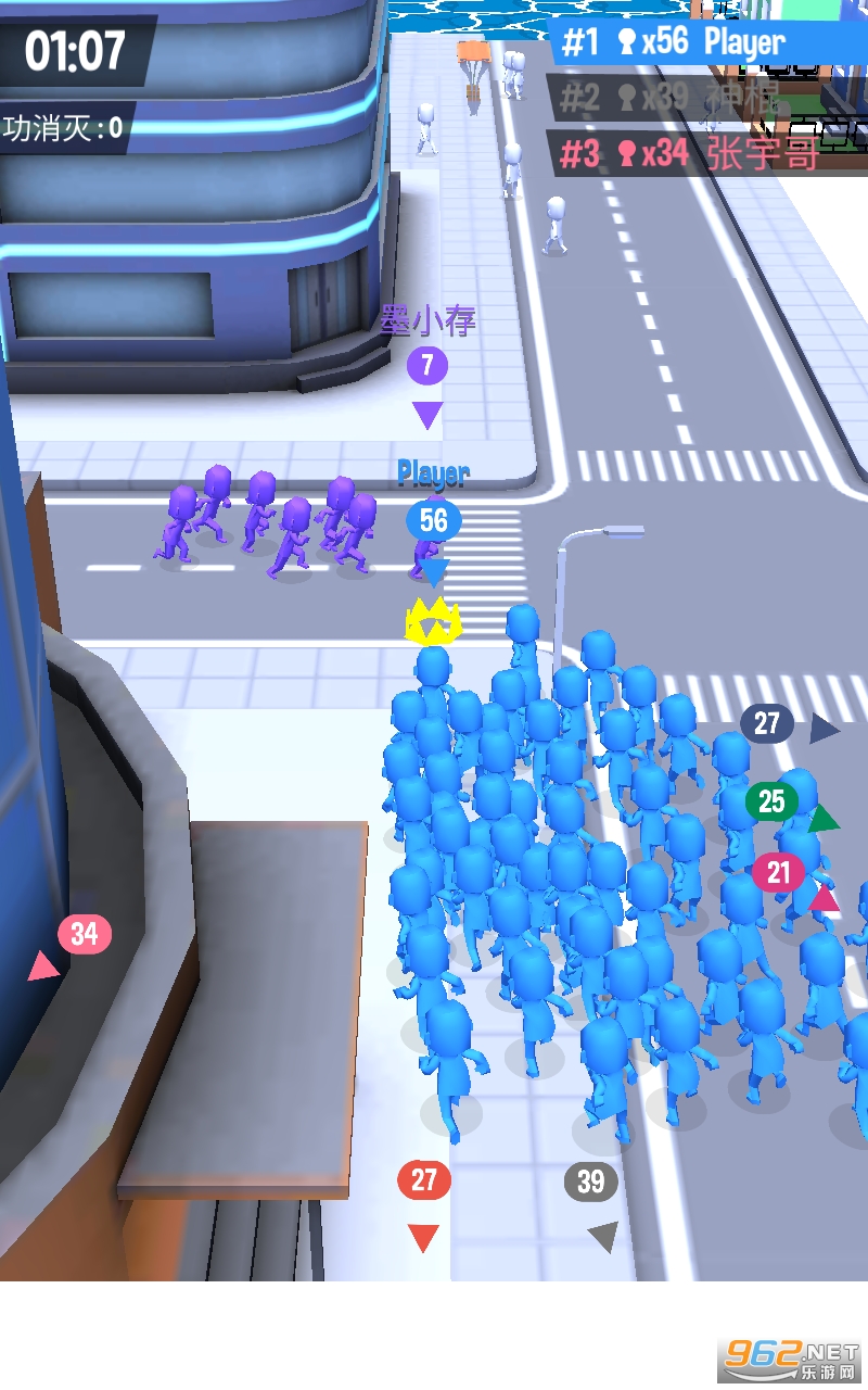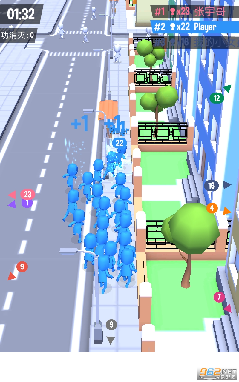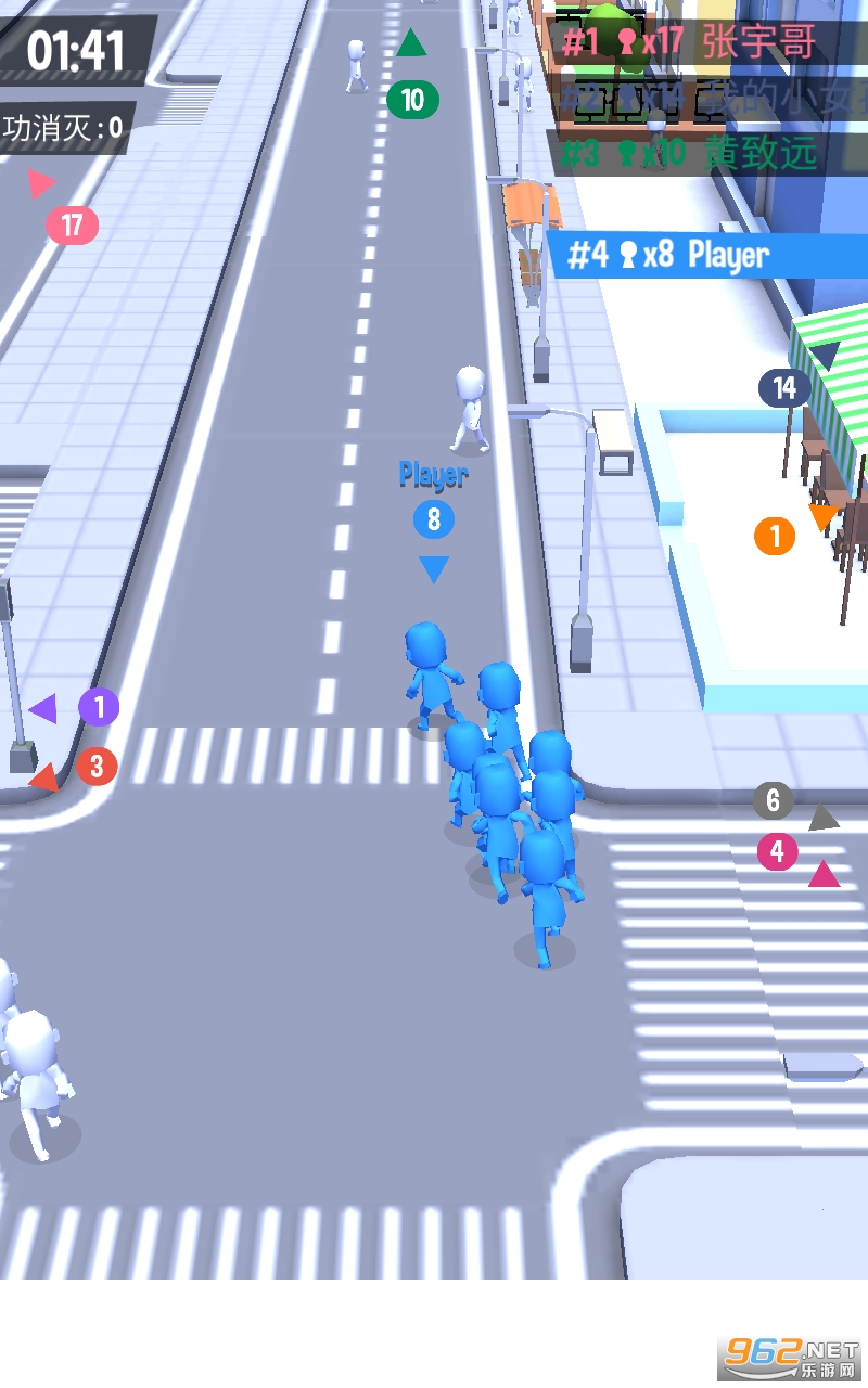 拥挤城市游戏是一款以城市为背景设计的人群大作战游戏,游戏的规则很简单,每个玩家开局就是一个只有几个人的小队伍,通过说服白色的行人加入自己的队伍,不断的吸纳行人壮大队伍的人数,如果发现其他人数较小的队伍也是可以去吸纳的,这样可以让你的人数增加的更快,随着游戏的进行你的人数会越来越多,可以体验到百人拥挤在城市道路上的震撼感觉。