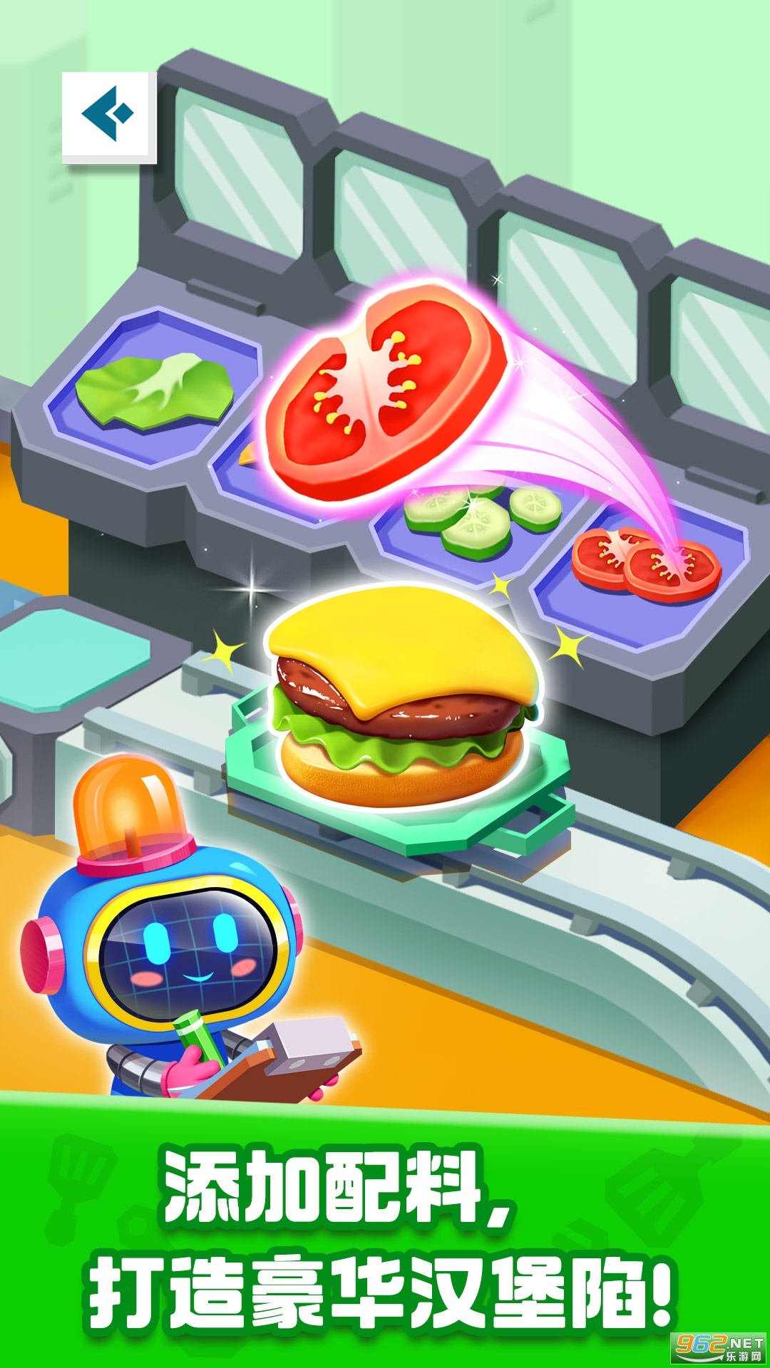 还差最后一道工序——添加面包盖,美味汉堡就能大功告成。不过还有一个小考验等着你——通过趣味弹球桌:快启动弹跳格,让汉堡进入弹球桌,翻滚起来!