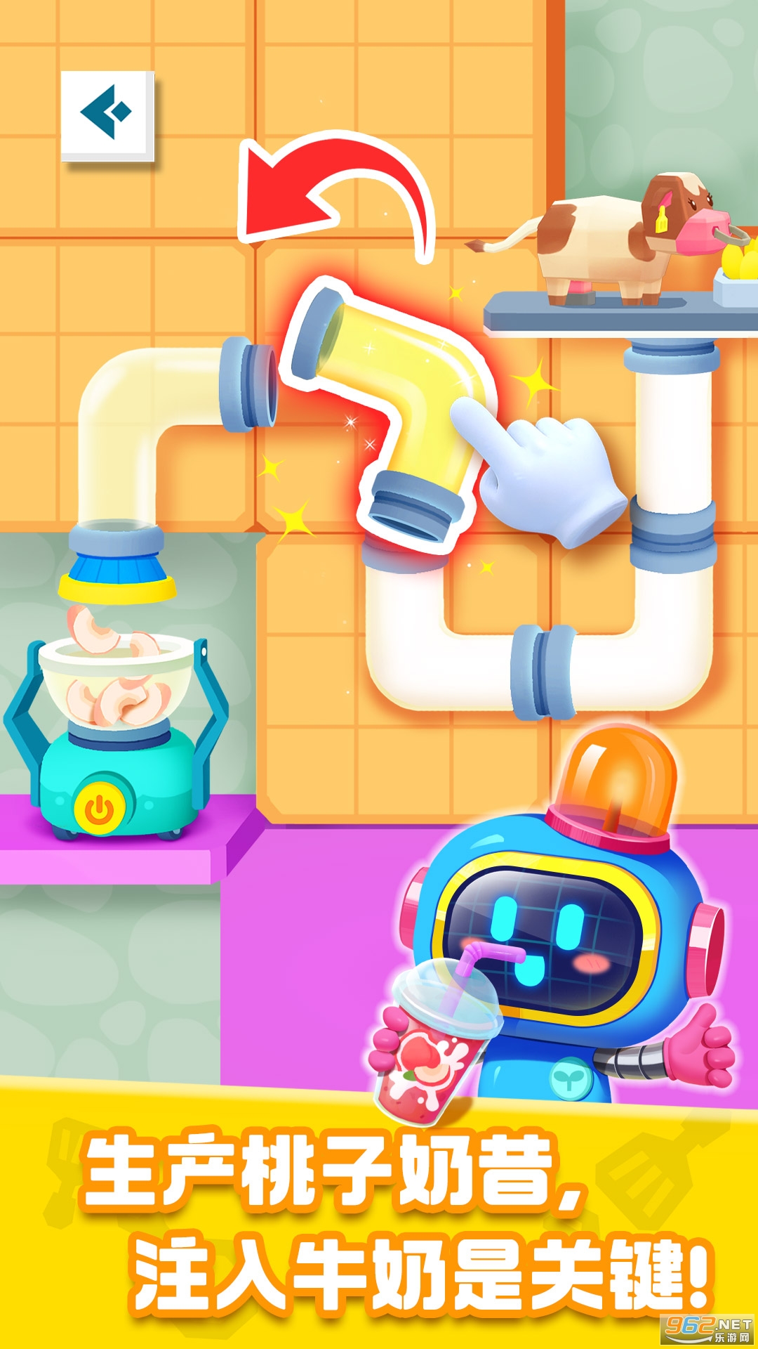 瞧,破壁机上方摆着几根打乱的管道,右端第一根已连入奶牛产奶处,你需要正确串联其余管道,让牛奶顺流而下,这时启动破壁机搅打,桃子奶昔就完成啦!