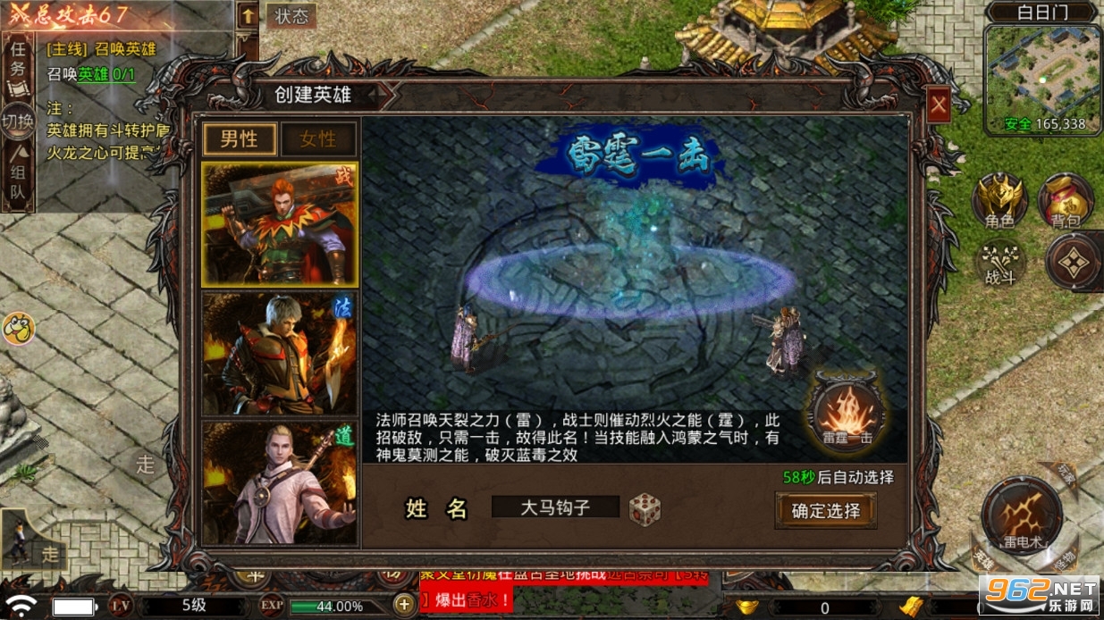 游戏的职业类型有道士、法师和战士,主角通过完成新手任务可以获得一名英雄,决定英雄职业后,通过主角与英雄共同完成主线任务可以领取奖励获得合击技能,主角与英雄的职业搭配不同,合击技能也是不一样的。
