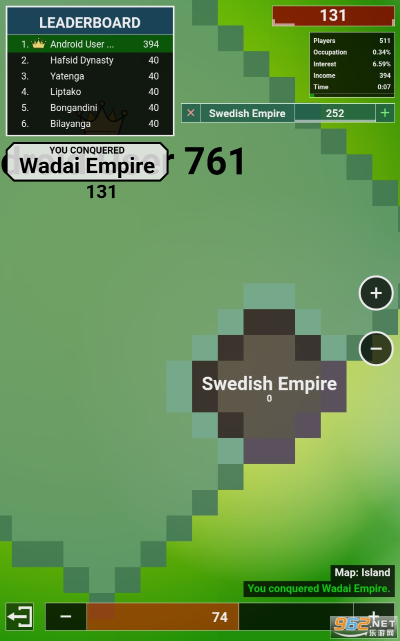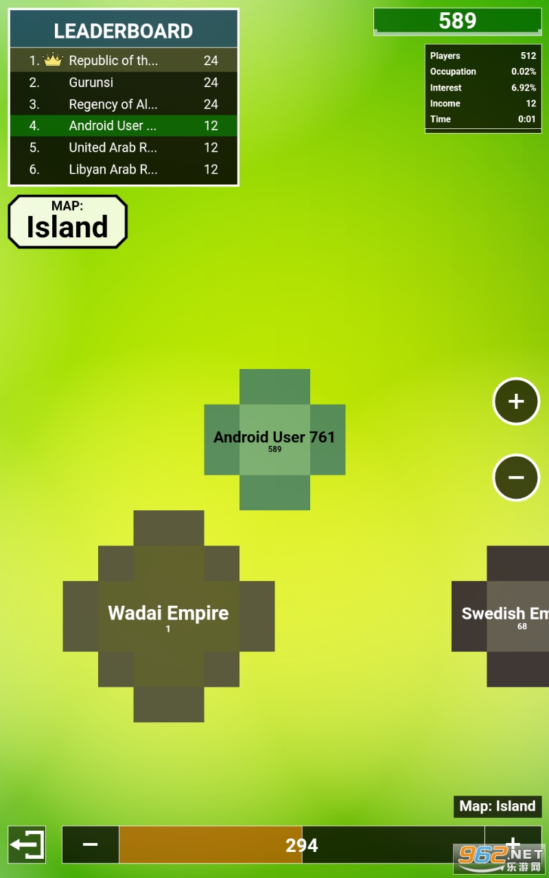 简单来说,一群玩家出生在地图上,每个人有一个大概代表战斗力的数值。然后随着时间的变化,这个数值会成长。玩家可以消耗这个数值去占领新的土地,或者侵略别的玩家。等到有一个玩家占据了 95% 以上的土地,游戏就宣告结束。