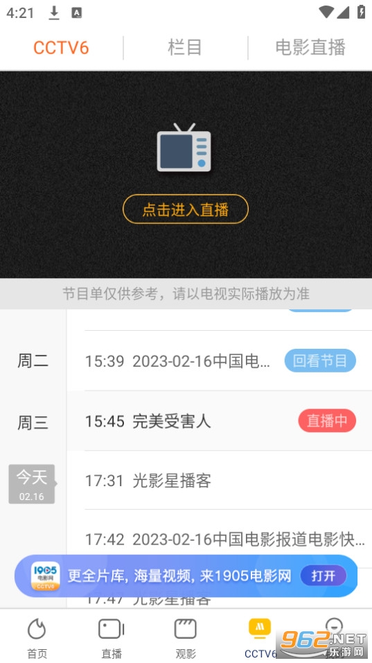 【主要节目】同步精彩呈现CCTV6官方节目,中国电影报道、电影全解码、今日影评、光影星播客、世界电影之旅、佳片有约等。