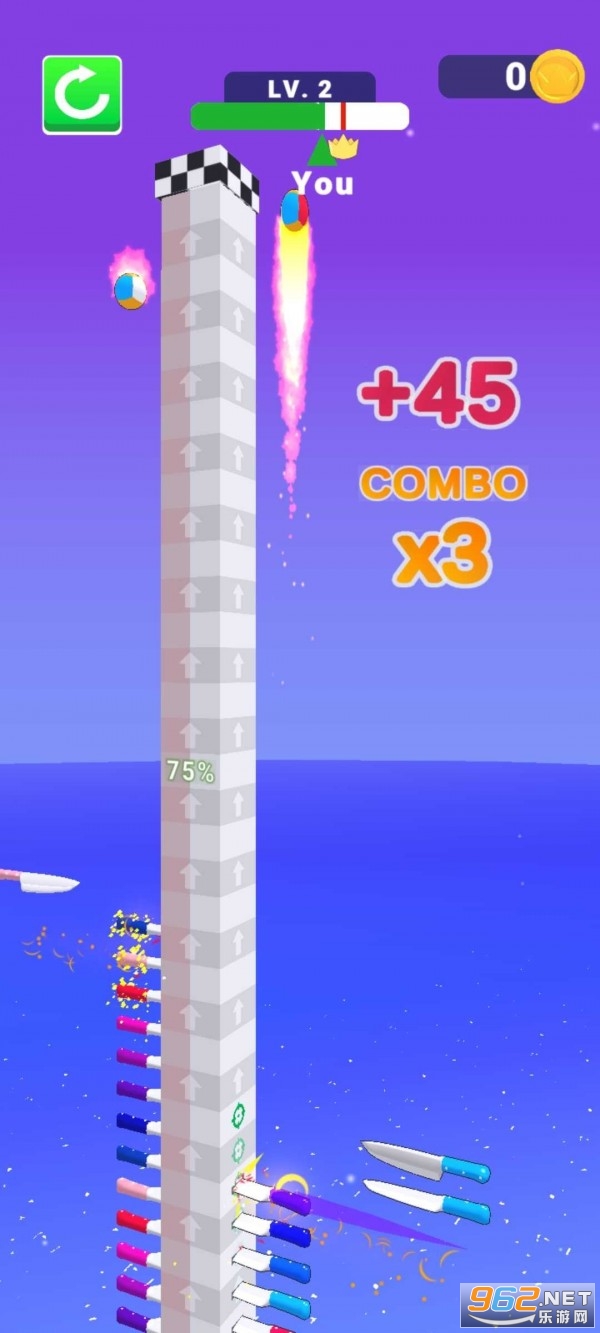 节奏飞刀为玩家带来轻松休闲的节奏挑战,玩家将控制飞刀在不断射击中扎到墙壁上,要把握相应的节奏,进行点击的飞刀投掷,期间不能扎破小球,否则任务失败,小球弹射的高度越高,获得的分数越高。