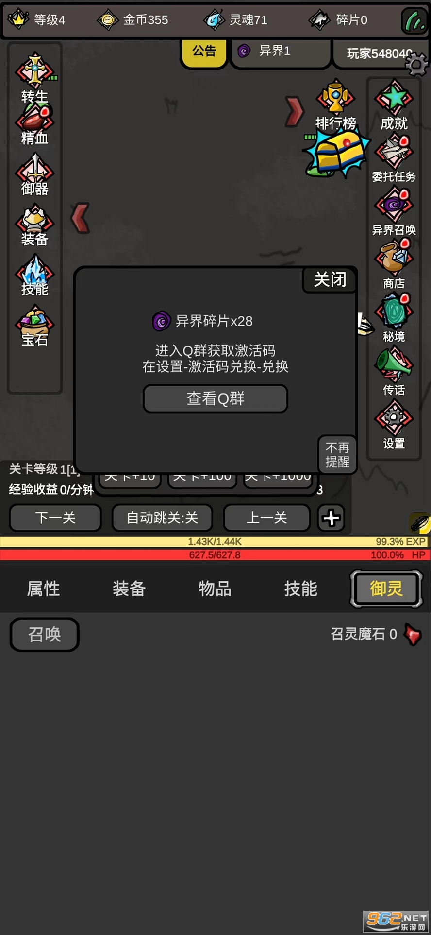 5、玩家升级的都是灵等级,灵等级的意义在于可以提前升级,也就是说当你转生时,如果你装备的灵等级是1000,那么你在一千级之前都不用升级了,他会跟着你一起升,新鲜的装备灵等级都是1。