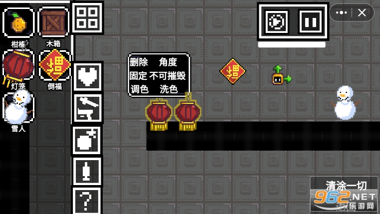 《柑橘游乐场》是一款玩法类似《甜瓜游乐场》的像素风沙盒模拟游戏,以柑橘为核心角色,里面有柑橘人,雪人,肥特,宝宝人等角色,投掷小刀,长刀,使用手枪,火箭筒,加特林,手雷,炸弹等武器在这里战斗,也可以模拟放烟花,贴福字,挂灯笼,感受浓浓的春节气氛,玩法自由自在!