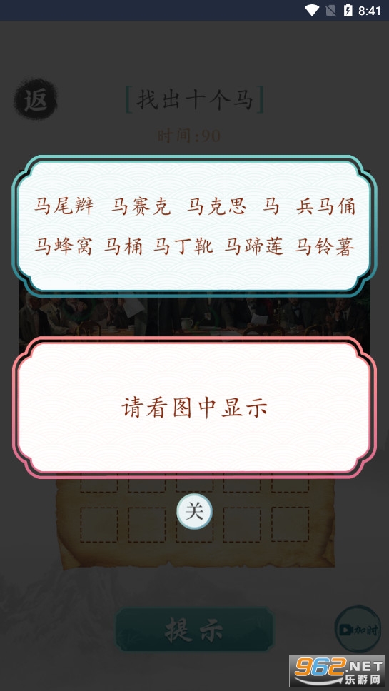趣味的文字游戏,玩家可以选择众多的文字关卡去进行调整,难度还是比较大的,比如找马的关卡,可以找到马蜂窝、马桶等,带马字的物品都算,喜欢的朋友可以下载试试。