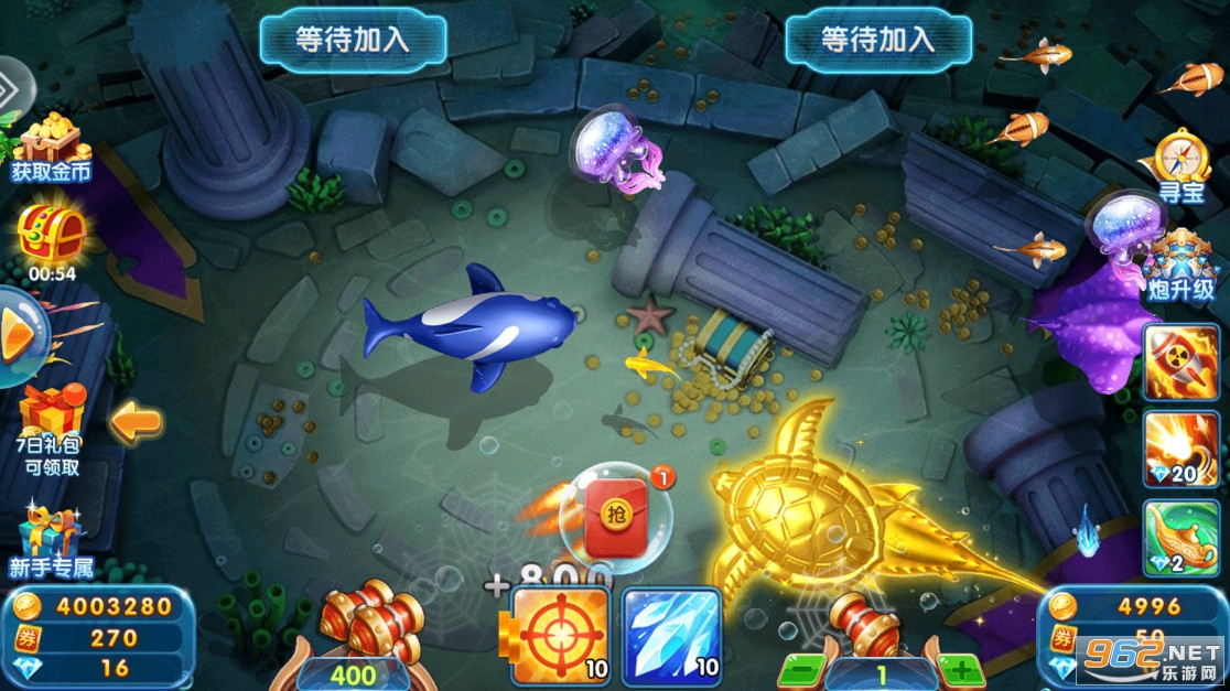 3、整个拼屏幕子弹反跳,最新炫酷武器特效冷冻、爆走、激光柱、核弹等专业技能,热情捕鱼无限体验。