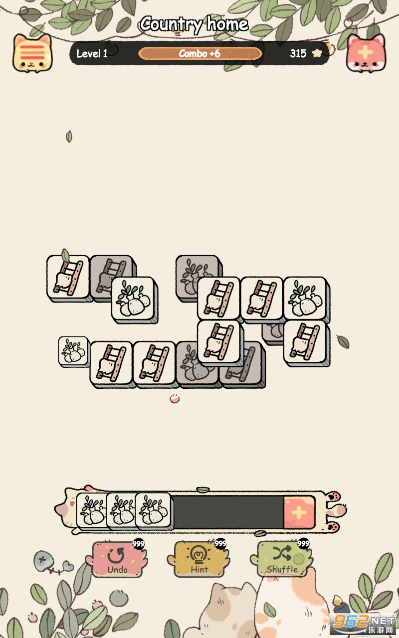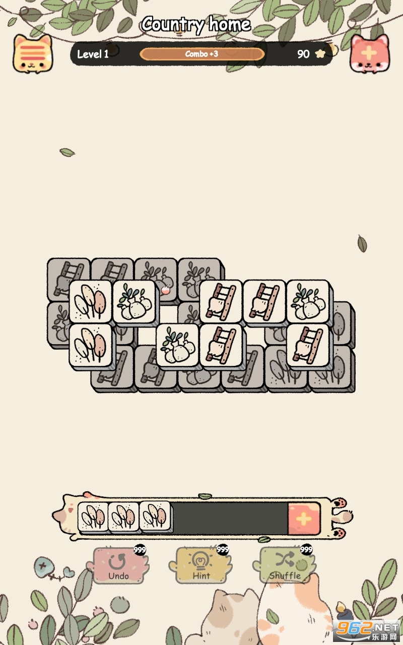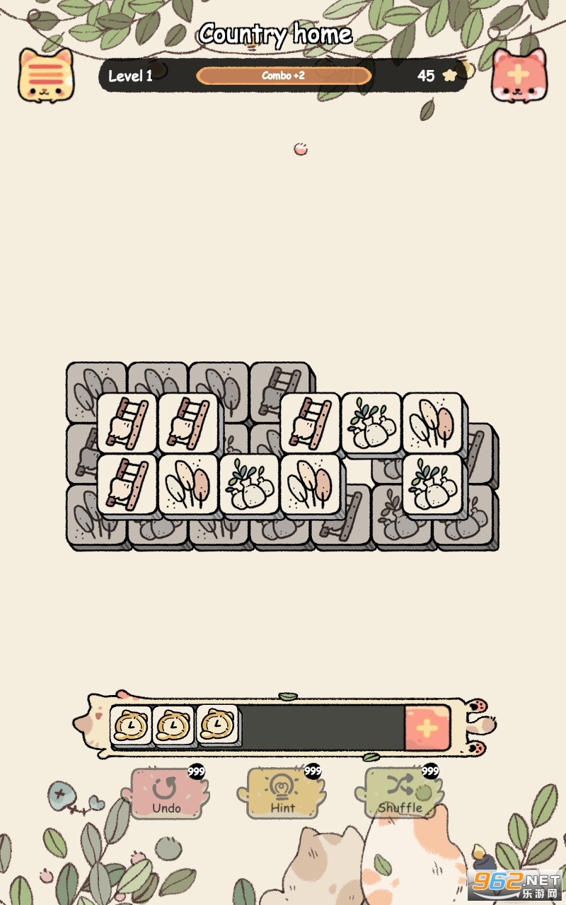 1、找到并点击3个相同的瓷砖,将它们放在底部的猫盒中。