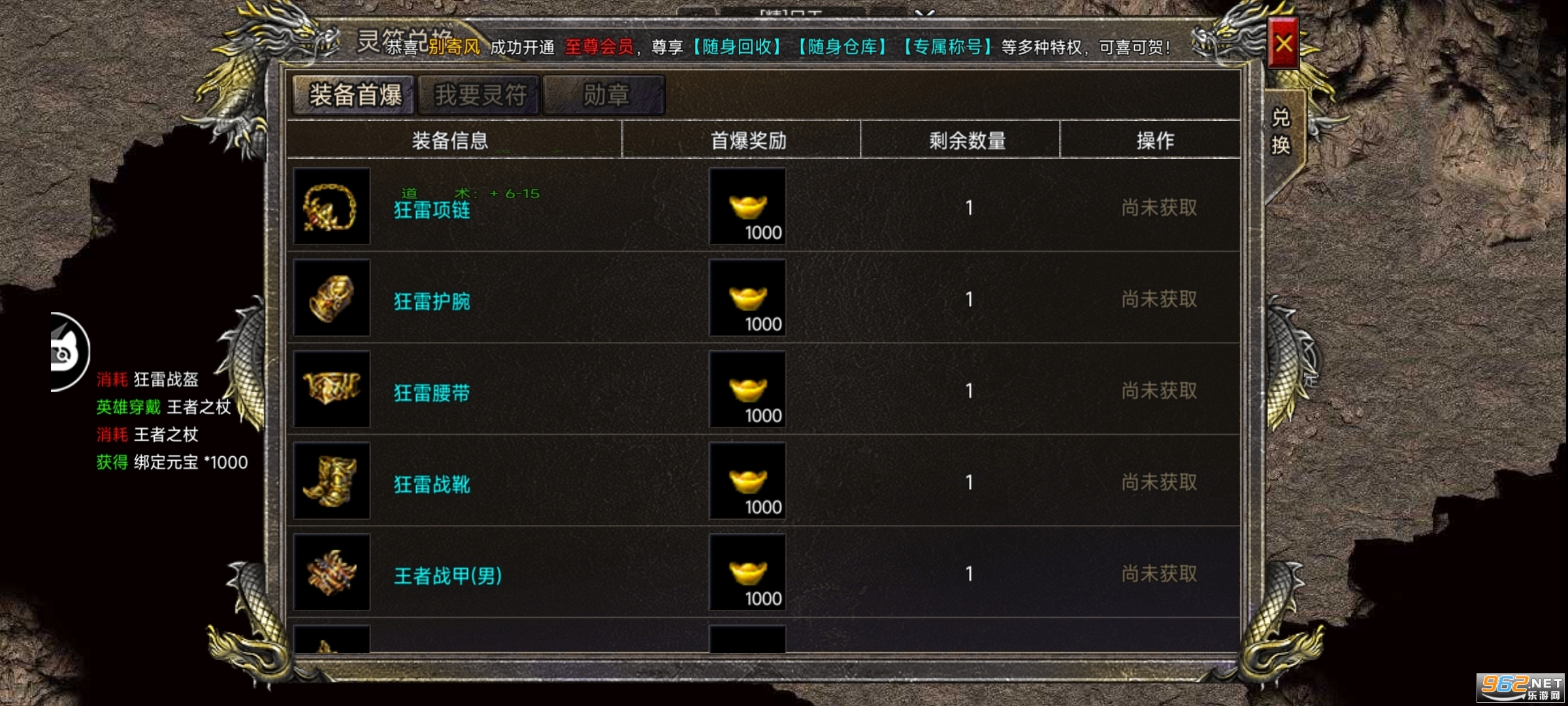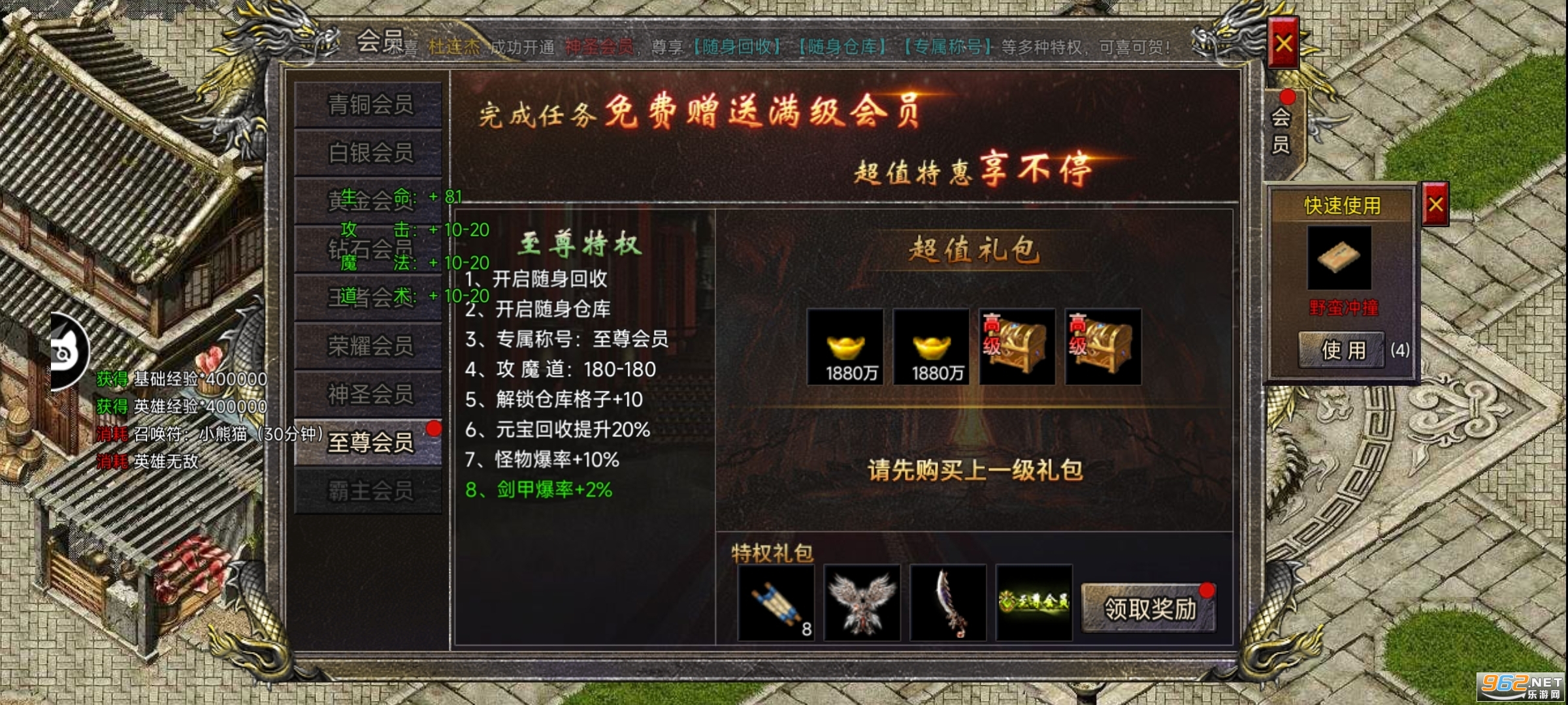 最后就是赞助:分别为钻石会员,武林至尊,最强王者,君临天下,所有特权都有专属麻痹,随身仓库,专属聊天标识,可打到物品非绑,免费进图 ,专属礼包,专属称号。