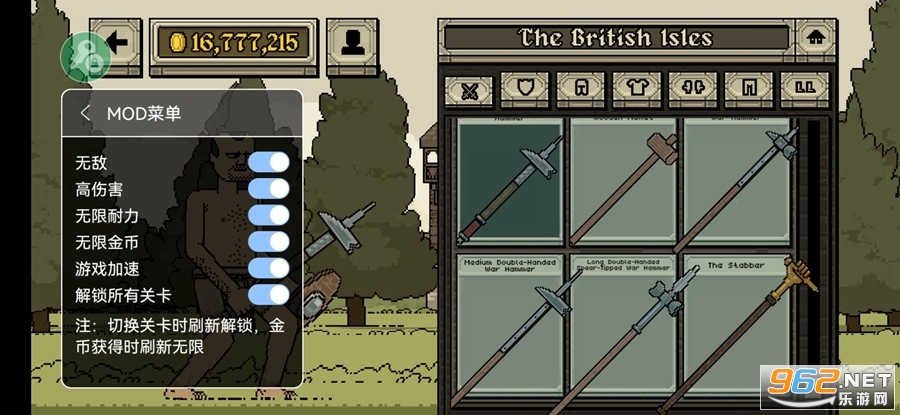《浴血混战破解版》是一款中世纪像素风动作冒险游戏,又名《该死的混蛋》,基于物理,拥有100个有趣的关卡,玩家可以在这里选择菜刀,弓箭,盾牌等各种武器,在竞技场和敌人格斗,直到把对方打到为止,还能不断地提升人物属性,解锁更多的武器,对战成千上万个混蛋!