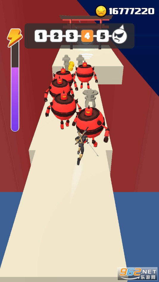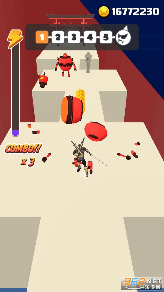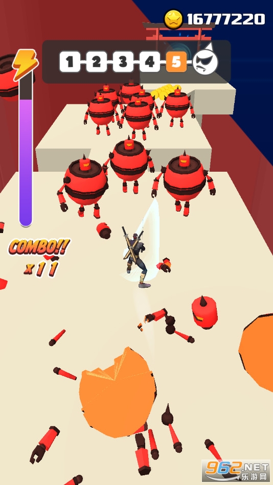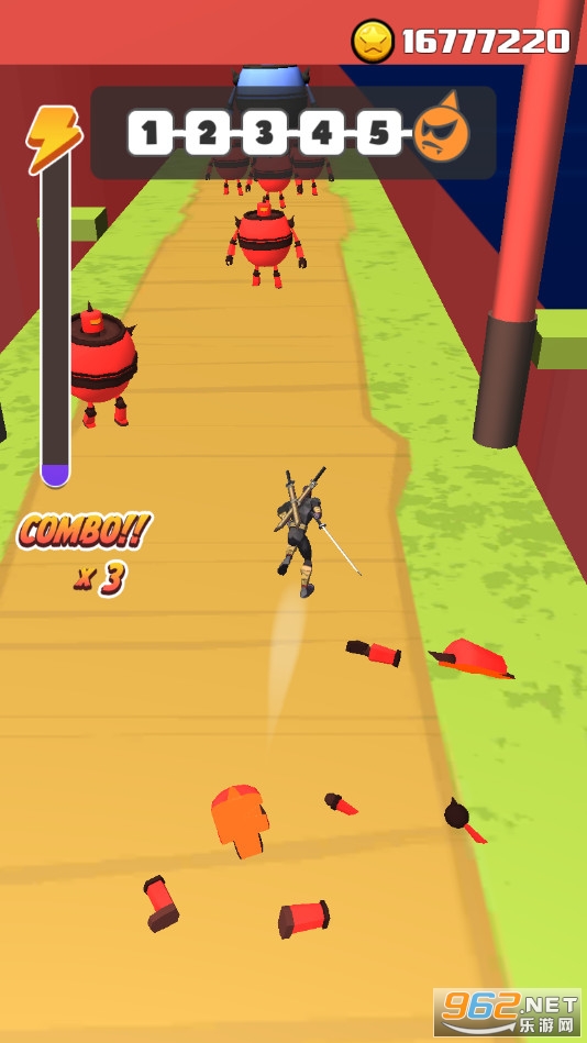 《街头忍者3D》是一款竖版闯关冒险手游,游戏中玩家将控制一个忍者冒险,点击滑动屏幕可以控制角色前行,松开屏幕可以进行劈砍,注意躲避敌人的攻击,将前方出现的机器人全部劈碎,每通过一些关卡就会出现boss,灵活走位,打败强大的敌人。
