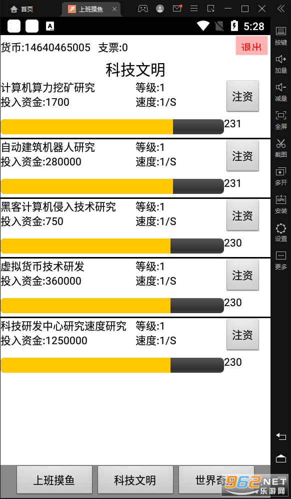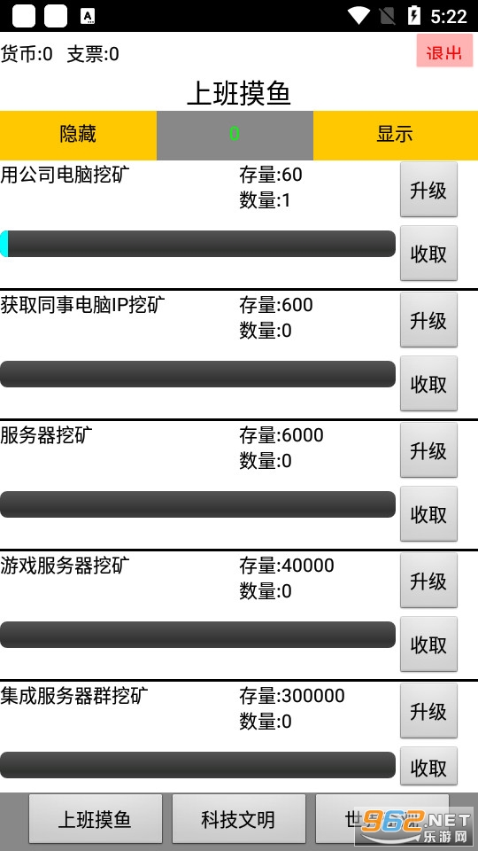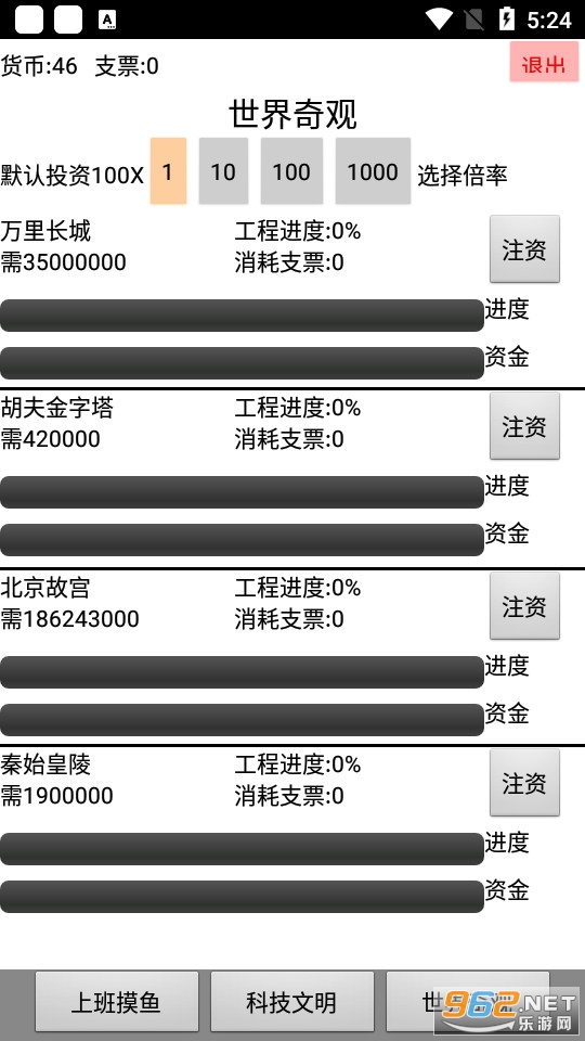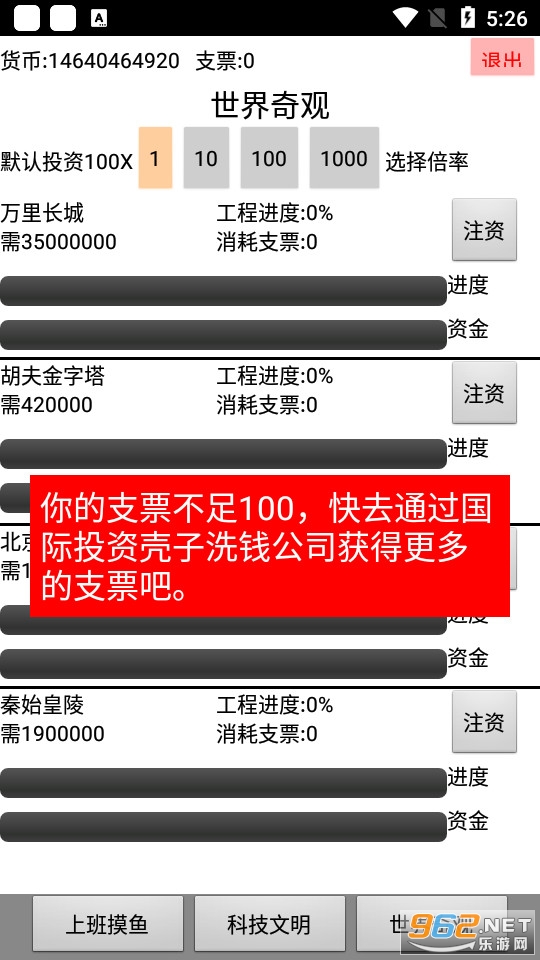 一款适合上班摸鱼的游戏,这是一款文字游戏,游戏的目的就是建造世界奇观,通过电脑挖矿赚钱,然后升级科技,把钱投入到世界奇观的建设工程,达到完成奇观的目的。