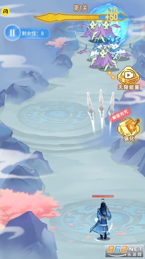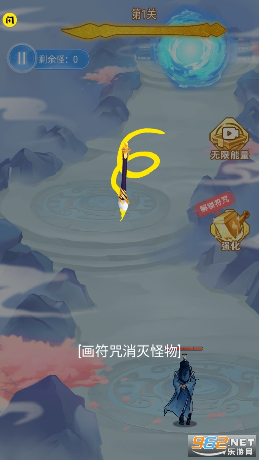 在驱魔大师中,玩家需要在屏幕上自己画符来使用技能去攻击怪物,击败的怪物会掉落能量,能量是画符的必要条件,只有击败的怪物才会掉落能量,画的线条越多,实用的符咒更加高级,伤害也会更高,在能量条空缺的情况下就无法画符,过关胜利后获得金钱可以在主界面强化你的血量,攻速,攻击力,符咒强化以及解锁更多新符咒!