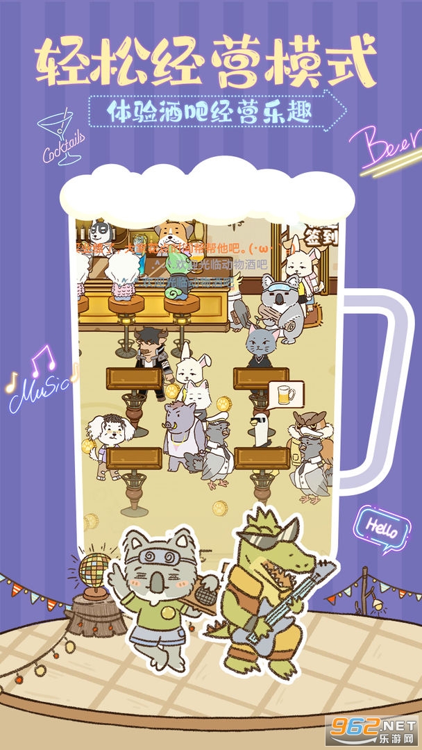 《动物酒吧》是一款卡通风格的休闲模拟经营游戏,在这款游戏中玩家将经营一间动物酒吧,你将不断的购买解锁新的家具让你的酒吧更加的完善,为不同的客人提供对应的酒水,游戏的玩法轻松治愈,现在就来下载试试吧!