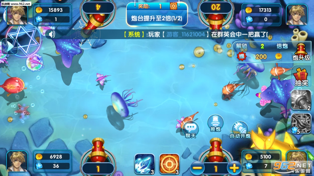 万炮轰炸,爆屏刺激,轻松直升功能让你打造强力炮台捕鱼所向披靡!
