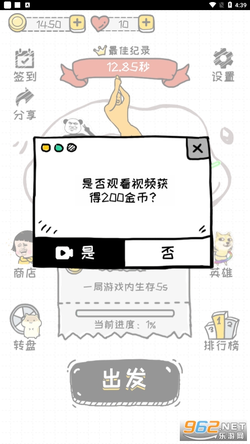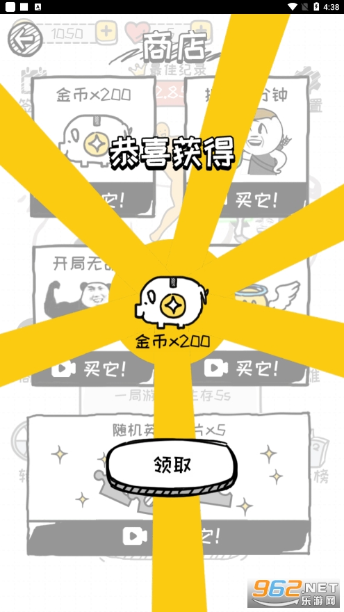 《再坚持亿下无限金币和无限钻石》是一款网红休闲虐手游戏,采用了极简的画风设计,玩法操作比较简单,玩家在游戏里面可以选择扮演不同的英雄,进入到游戏里面灵活走位,躲避各种武器的攻击,活得越久分数越高,获得的奖励越丰富,还可以通过奖励来解锁英雄,道具使用!