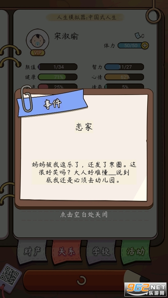 《人生模拟器:中国式人生》是一款【模拟】+【文字】类型的游戏,游戏里的一切都是随机发生的,高自由度。你将随机出生在某个国家城市,某个家庭,经历从0岁开始慢慢长大,打工创业,娶妻生子,终老病死,甚至是你平常你敢想而不敢做的事儿都可以体验。你的性别、属性、天赋擅长都是随机的,只有你自己所做出行动和选择可以改变它们。游戏可以体验无数次,也会产生无数次不同的结果,想要玩的出彩,还得动动脑筋。