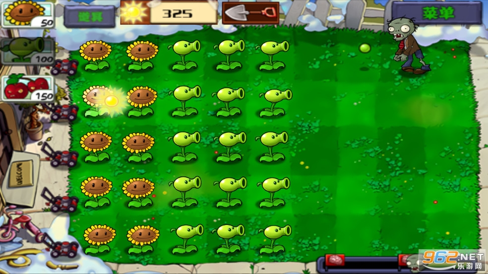 玩家防御僵尸的方式就是栽种植物。49种植物每种都有不同的功能,例如樱桃炸弹可以和周围一定范围内的所有僵尸同归于尽,而食人花可以吃掉最靠近自己的一只僵尸。