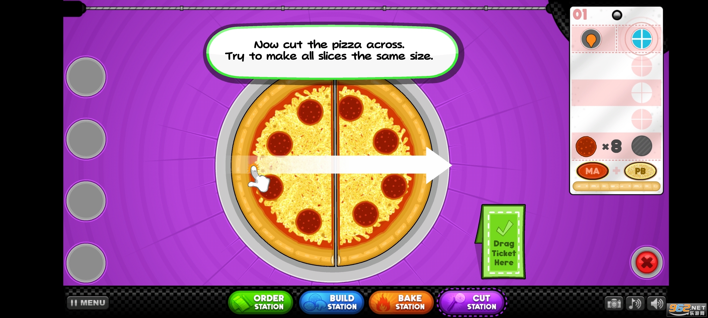 餐厅中的每个站点都是一个动手操作的过程,您必须在所有不同站点之间执行多项任务才能跟上您的披萨订单。选择一个外皮,加入酱汁和奶酪,并在比萨饼中加入各种美味的配料。将比萨饼滑入烤箱,等待烤得恰到好处。前往切割站将披萨切成完美的薄片,然后将完成的馅饼提供给饥饿的顾客!