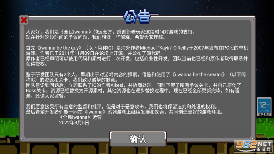 全民iwanna是一款横版闯关类手机游戏,各种千奇百怪的关卡将会在游戏中来让玩家们尝试去挑战。游戏中所有的机关都将会是隐藏的,只有玩家们依靠自己不断的挑战,来累计自己的过关经验,才可以顺利的通过每一个关卡。是的!很虐!运营小王我第一关都没过,太难了!!!这款产品目前的关卡都是我们自研开发,产品上还有很多不足!请多多指教!感谢IG作者的开源!感谢IC作者的监督指教!我们还小。。因为只有2个开发和多个项目并行,争取一周一关卡吧(不敢保证,技术你懂得)。