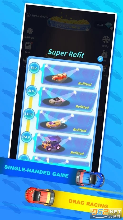 3、您可以使用数百辆汽车,并使用玩家获得的金币来解锁赛车和道具。