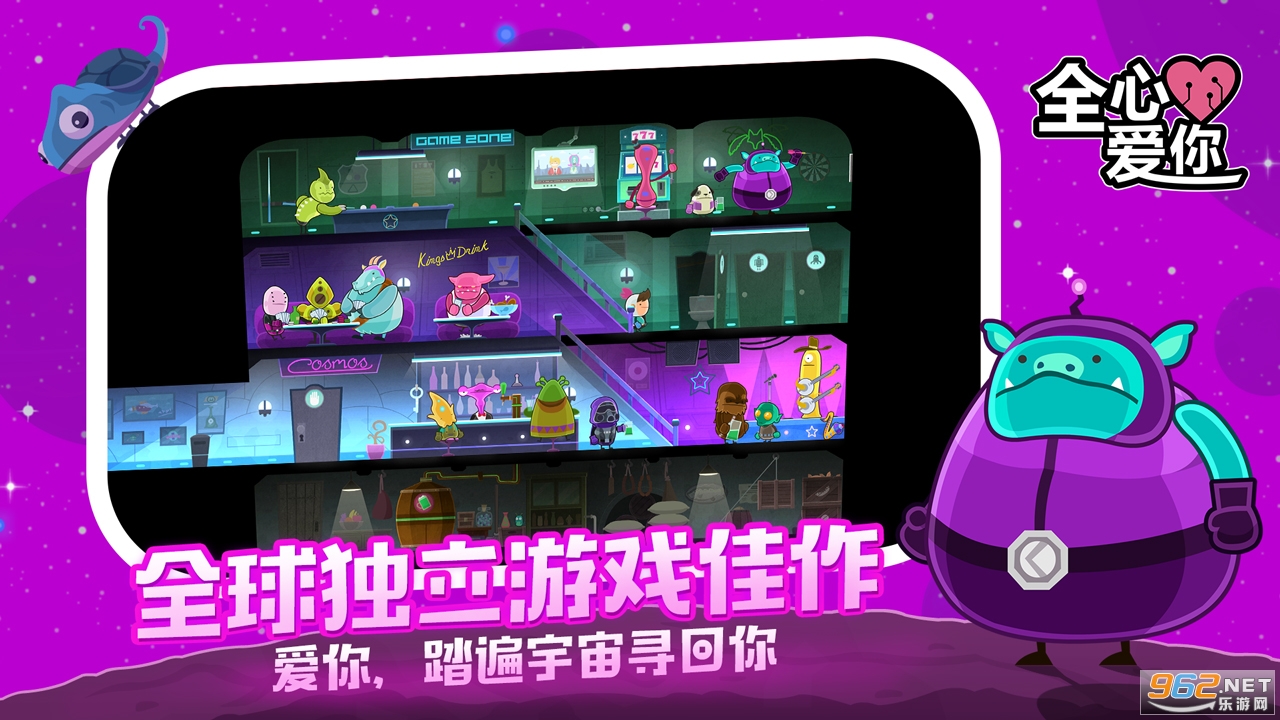 《全心爱你》(Love You To Bits)是一款画面清新的带有科幻风格的恋爱冒险手游,游戏中的主角叫做Kosmo,是一个宇宙探险者,玩家的任务就是帮助Kosmo去探索众多的星球,前往各个地方去寻找机器人女友的碎片,收集全部的碎片最后让女友恢复过来。