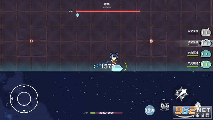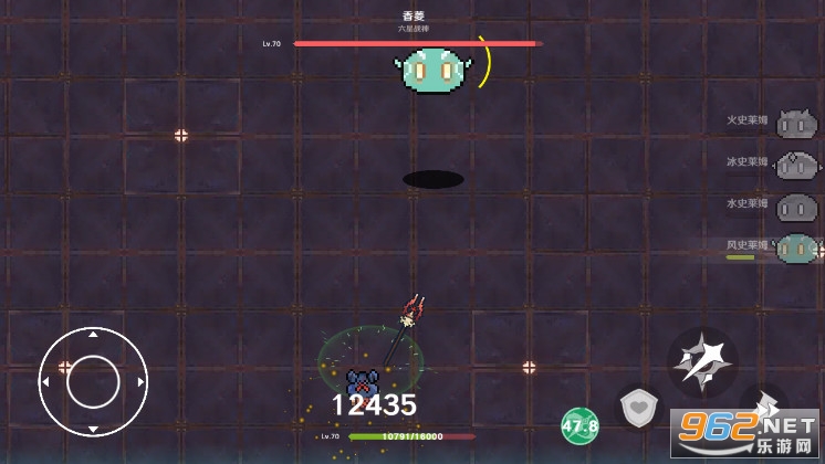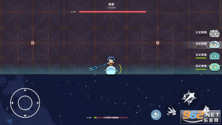 玩家操纵的角色是一只史莱姆,一样有攻击、闪避、跳跃和技能这几个按键。地图景色看起来没有什么差别,可能就是使用的素材来制作的整个地图。
