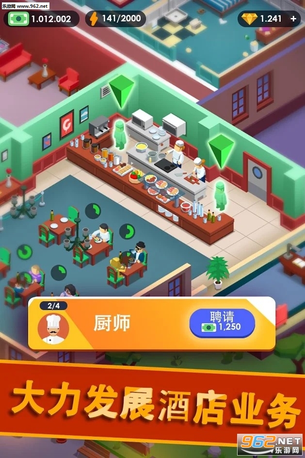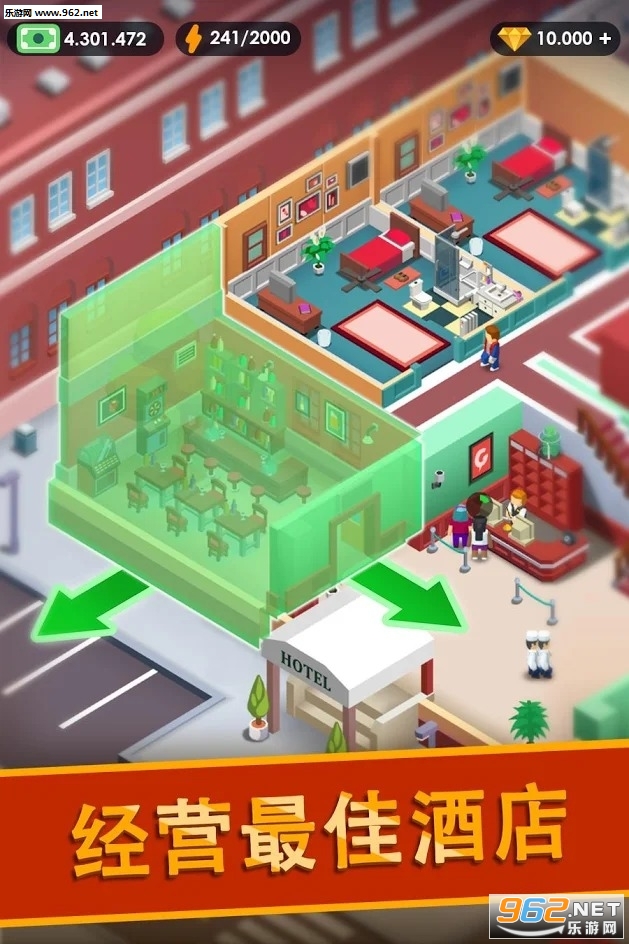 负责人力资源部并有效管理员工:为游泳池雇佣救生员,为VIP客户提供司机或按摩师,雇佣搬运工、厨师或酒保,招聘维修工人和清洁服务。仔细选择您的商业决策,并在您的酒店帝国形成一个坚实的工作团队。