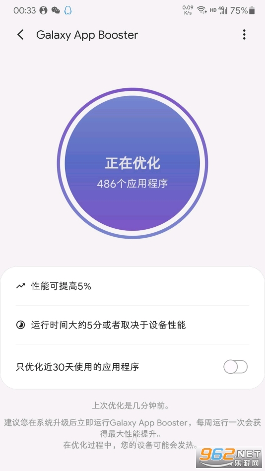 -软件会自动记录上一次加速优化的时间,打开软件后会自动提醒用户优化手机;