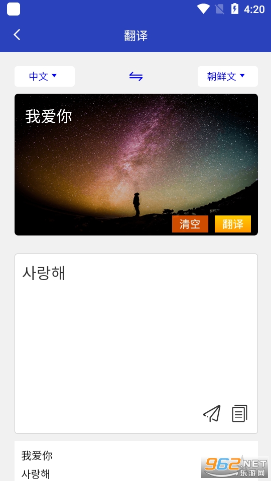 朝文、汉文双语互译,快速文本翻译,一秒出结果,是工作、学习、日常生活交流、旅游的朝文翻译神器,可以提高朝鲜文汉文文字互译,实时翻译、查询校对、文件整理等工作的效率和质量。支持朝鲜文和中文的切换和输入,支持文本复制和分享功能,翻译文字大小调节等。