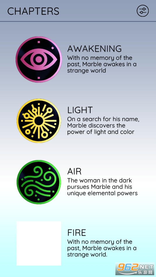 Marble 发现他不仅仅是一个学习光、空气和火的元素力量的金属球。他访问的每个世界都会带来新的力量、新的敌人和新的谜题挑战。你能引导大理石找到他的名字和他的家吗?